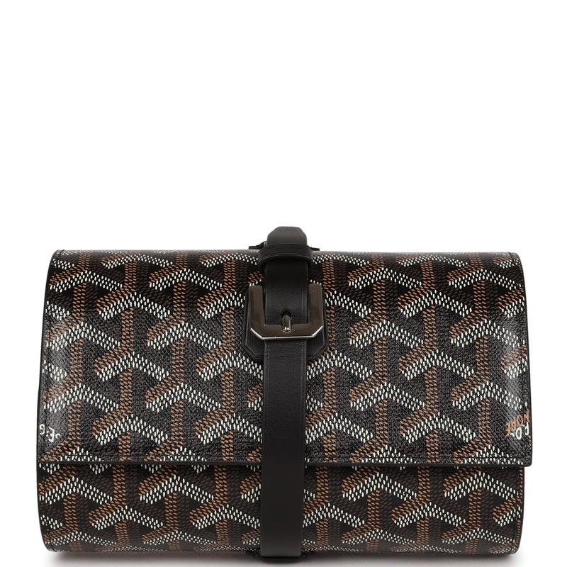 This Goyard Double Travel Watch Case is in Black Goyardine Canvas and Clamecy Cowhide with palladium hardware, tonal stitching, features two leather cushion watch inserts, strap, and buckle closure.